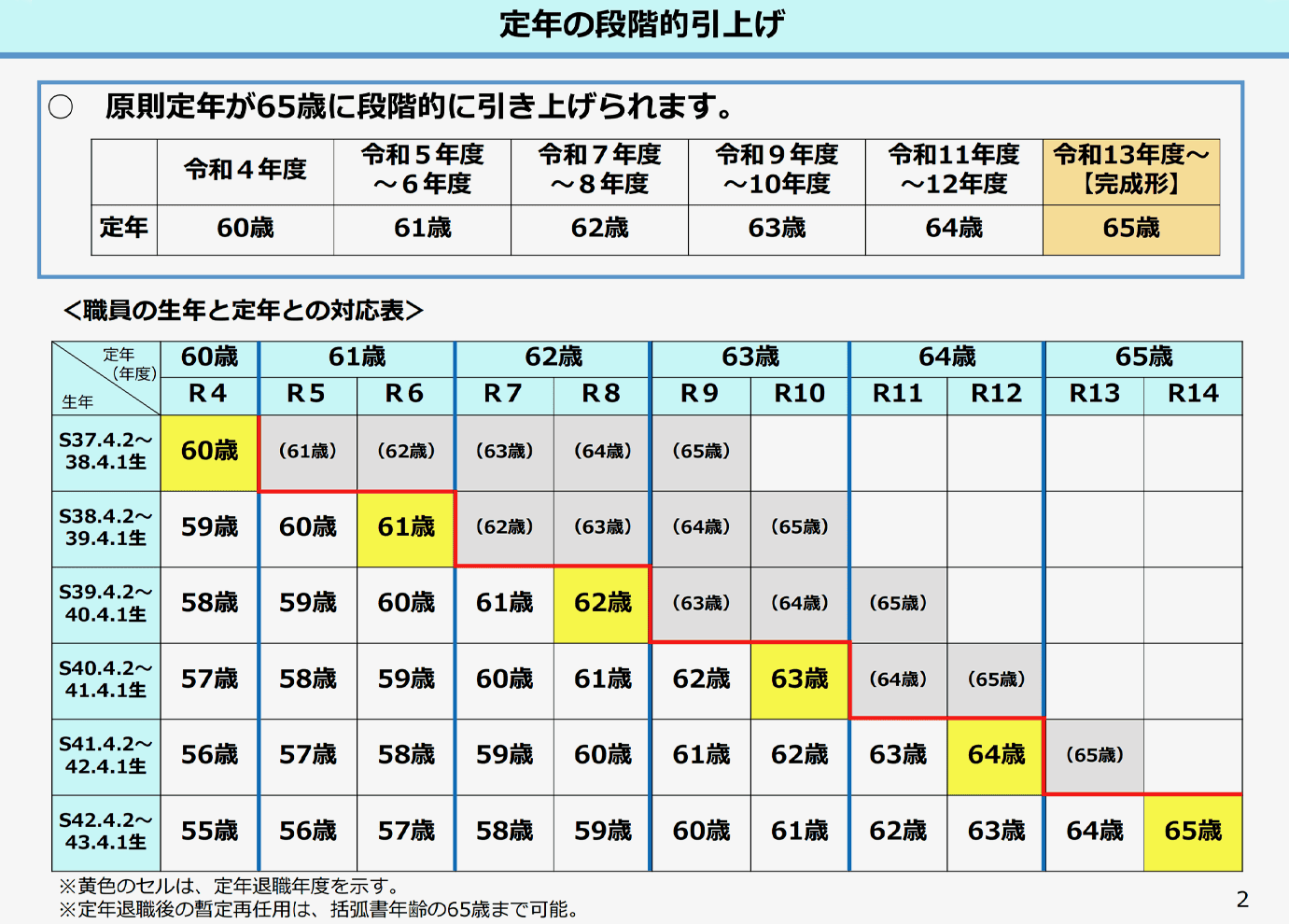 ※1 令和5年4月に、国家公務員法等の一部を改正する法律(令和3年法律61号)が施行されました。これにより、原則60歳とされていた定年年齢が2年に1歳ずつ段階的に引き上げられ、令和13年度に65歳となります。(参考: 国家公務員の定年の引上げ(概要))