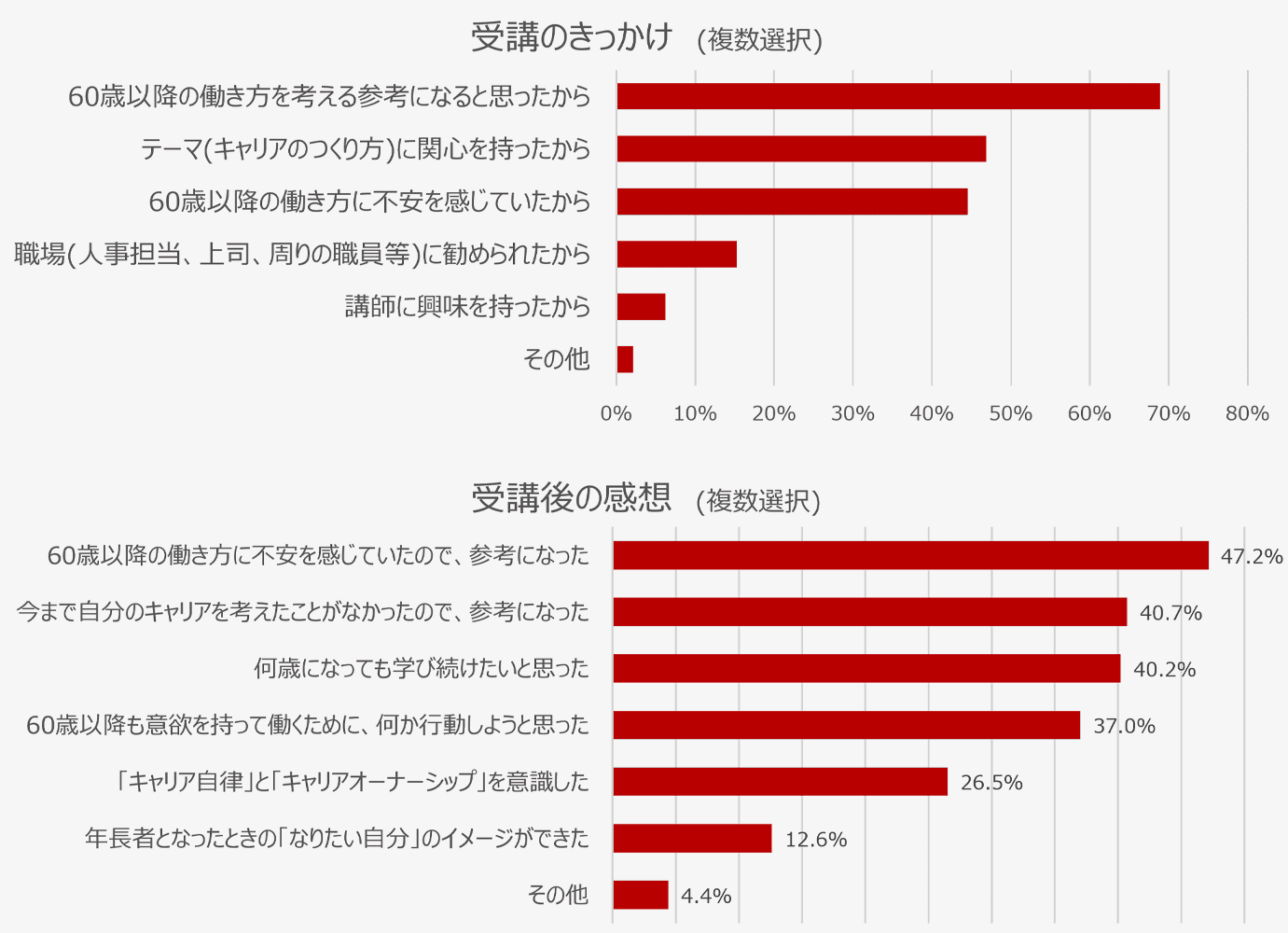 また、全体の37.0%から「60歳以降も意欲を持って働くために、何か行動しようと思った」と回答があり、本講演で目指していた、「気づきを得て、小さくても何か行動に移す」という動機づけは、十分に達成できたと思います。特に講演の中で田中さんがお話された、定年前の集大成としての「卒業制作」や、業務外も含めて自身がどのような人でありたいかを表す「二枚目の名刺」について、「テーマを考える時間のある【今】聴くことが出来て良かった」、「想像したらワクワクしました」などの感想が寄せられています。